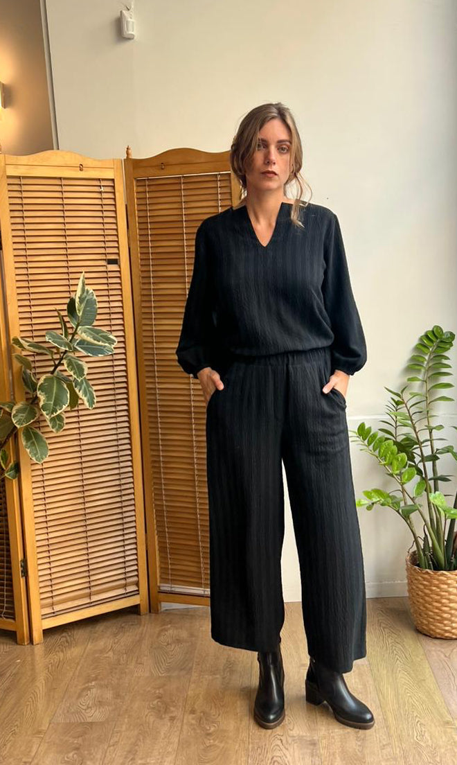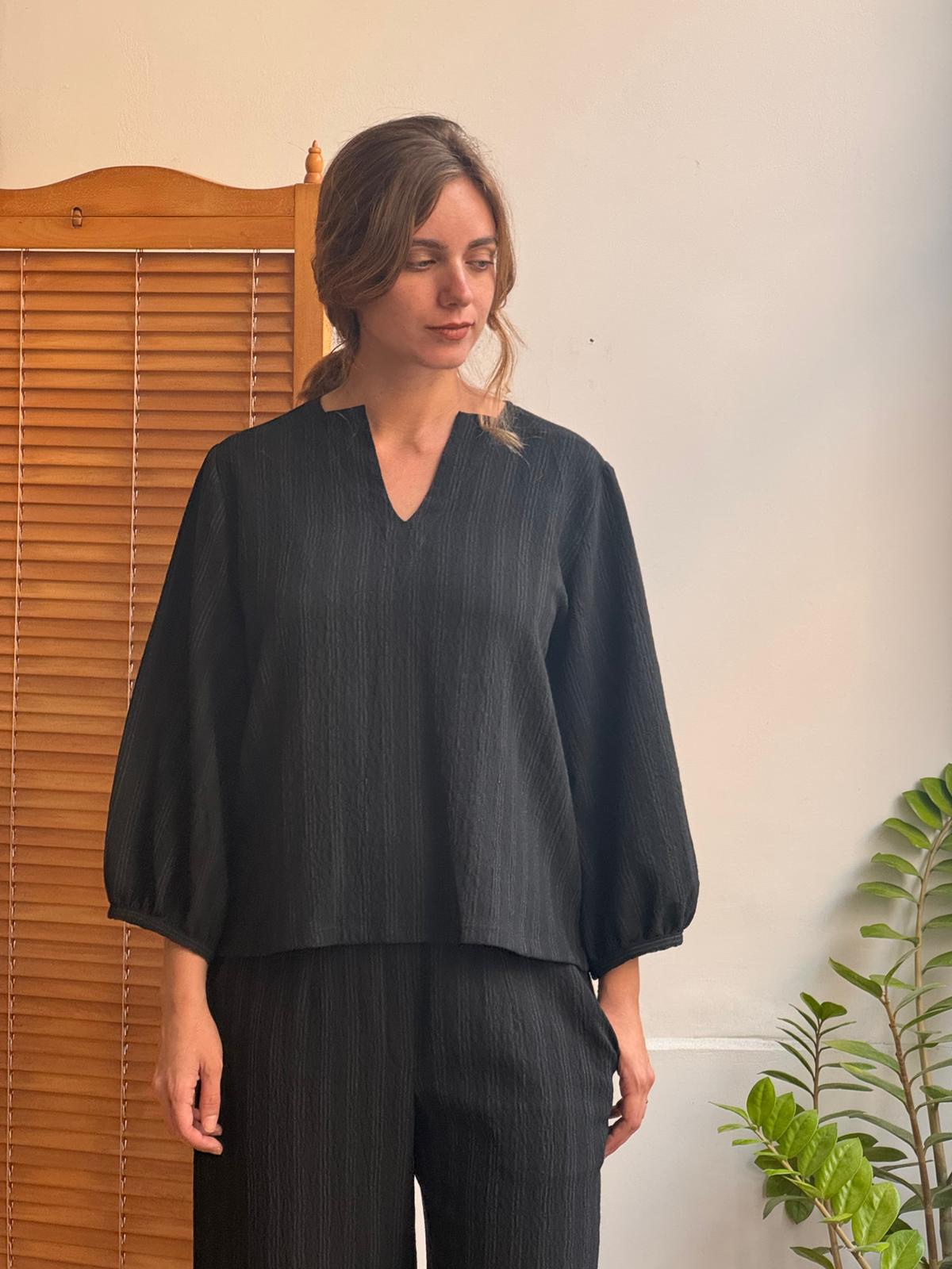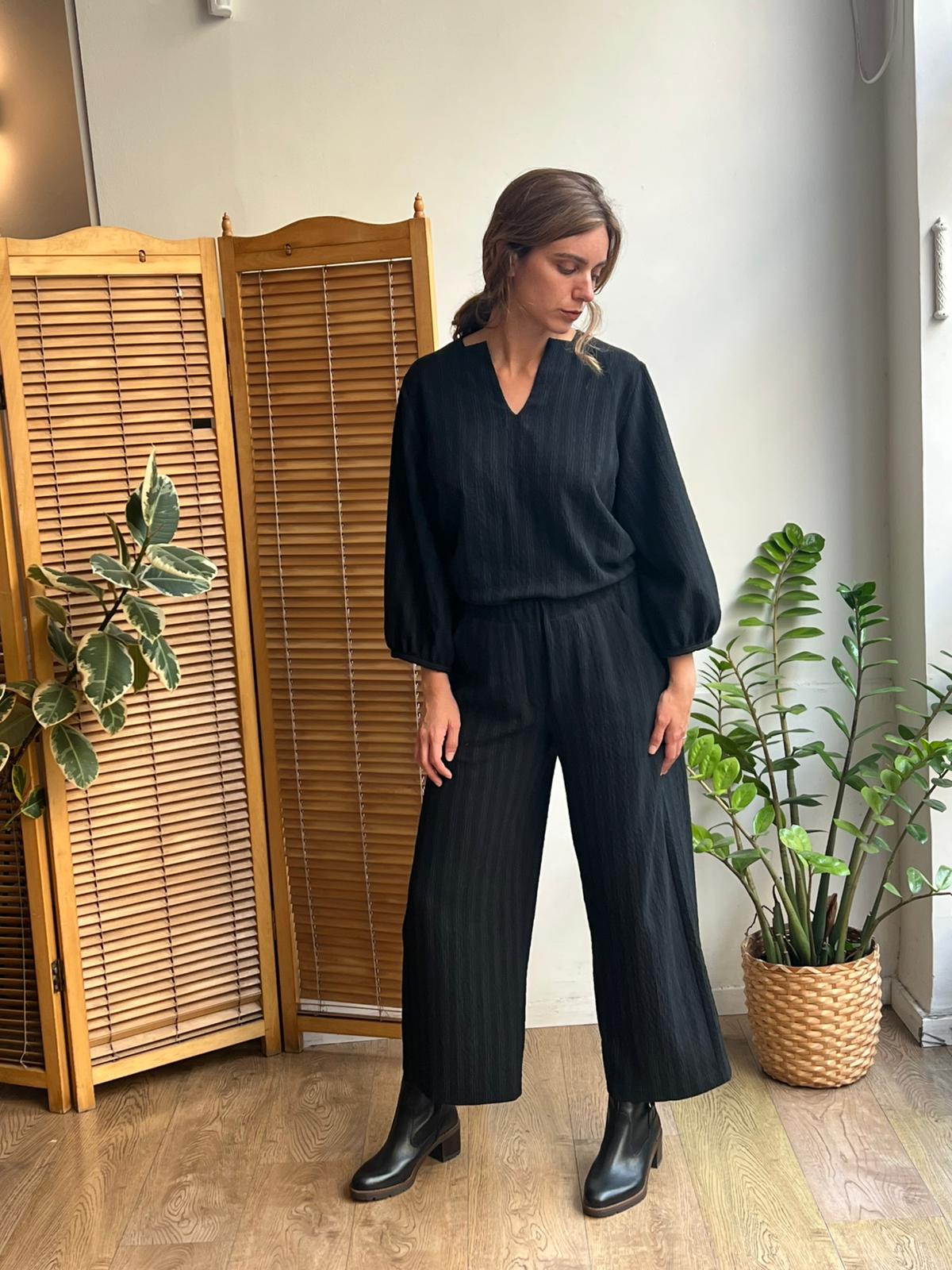 חולצת פאף שחור פס בשילוב מכנסי בלאנקו תואמים