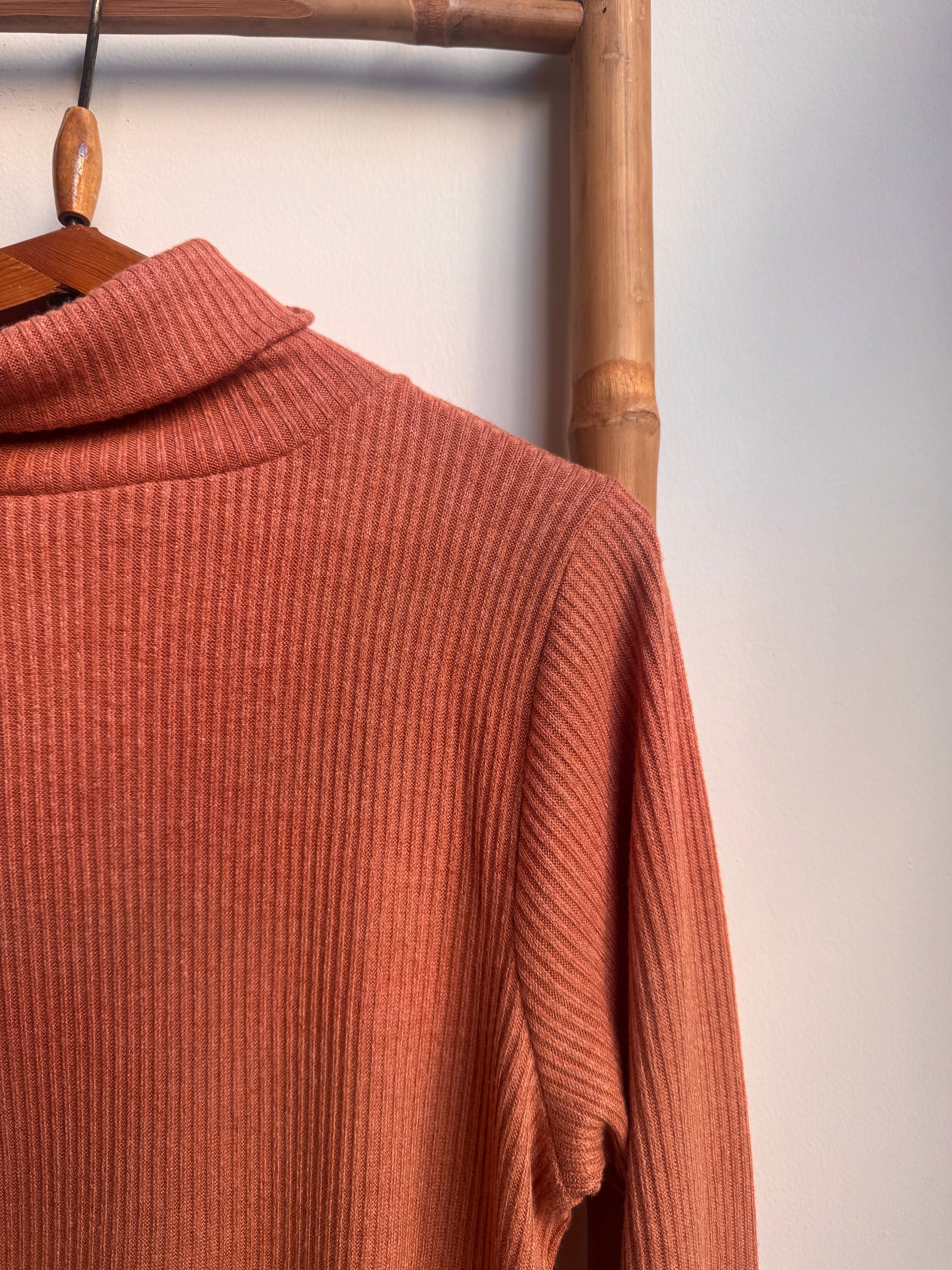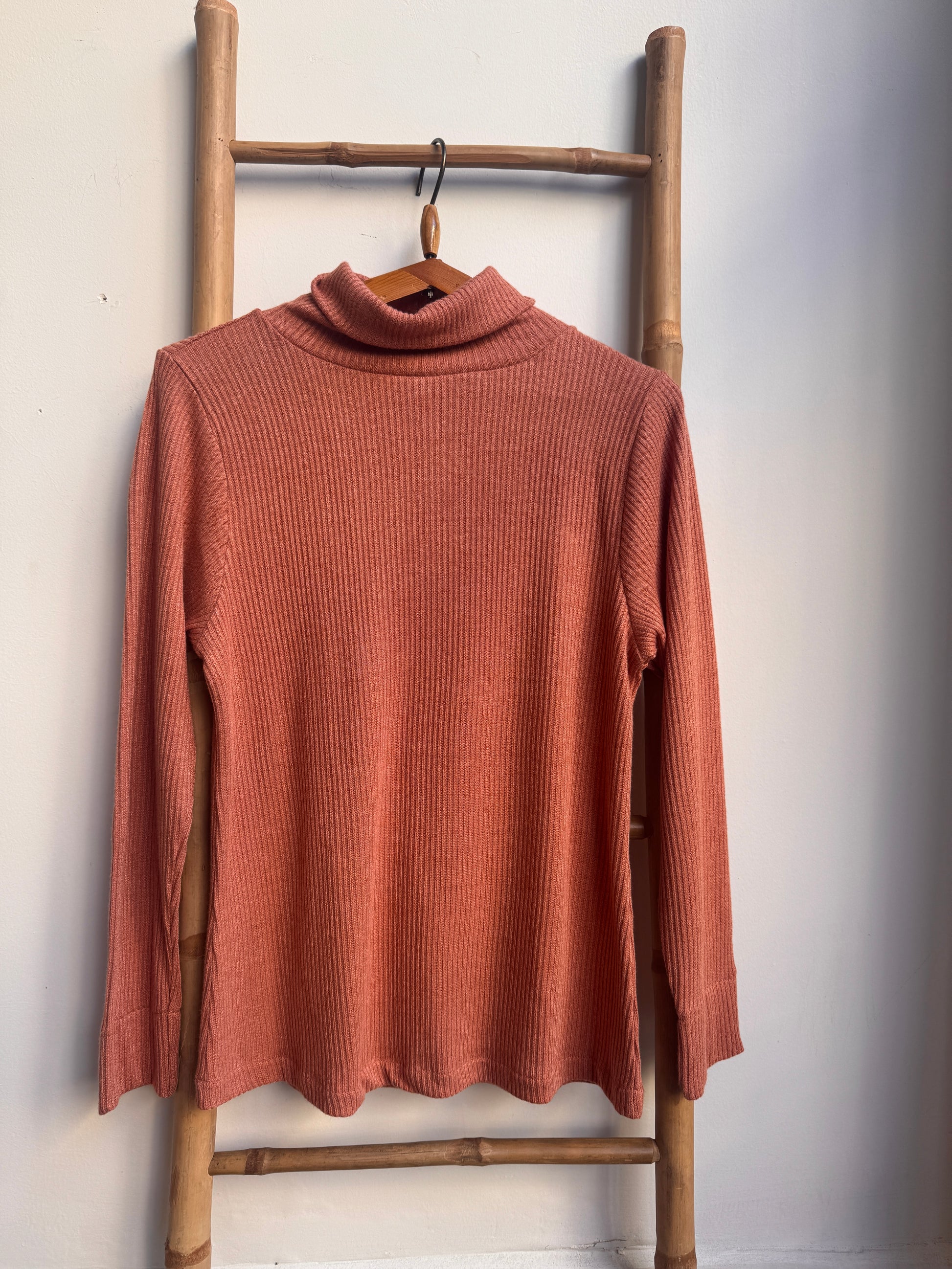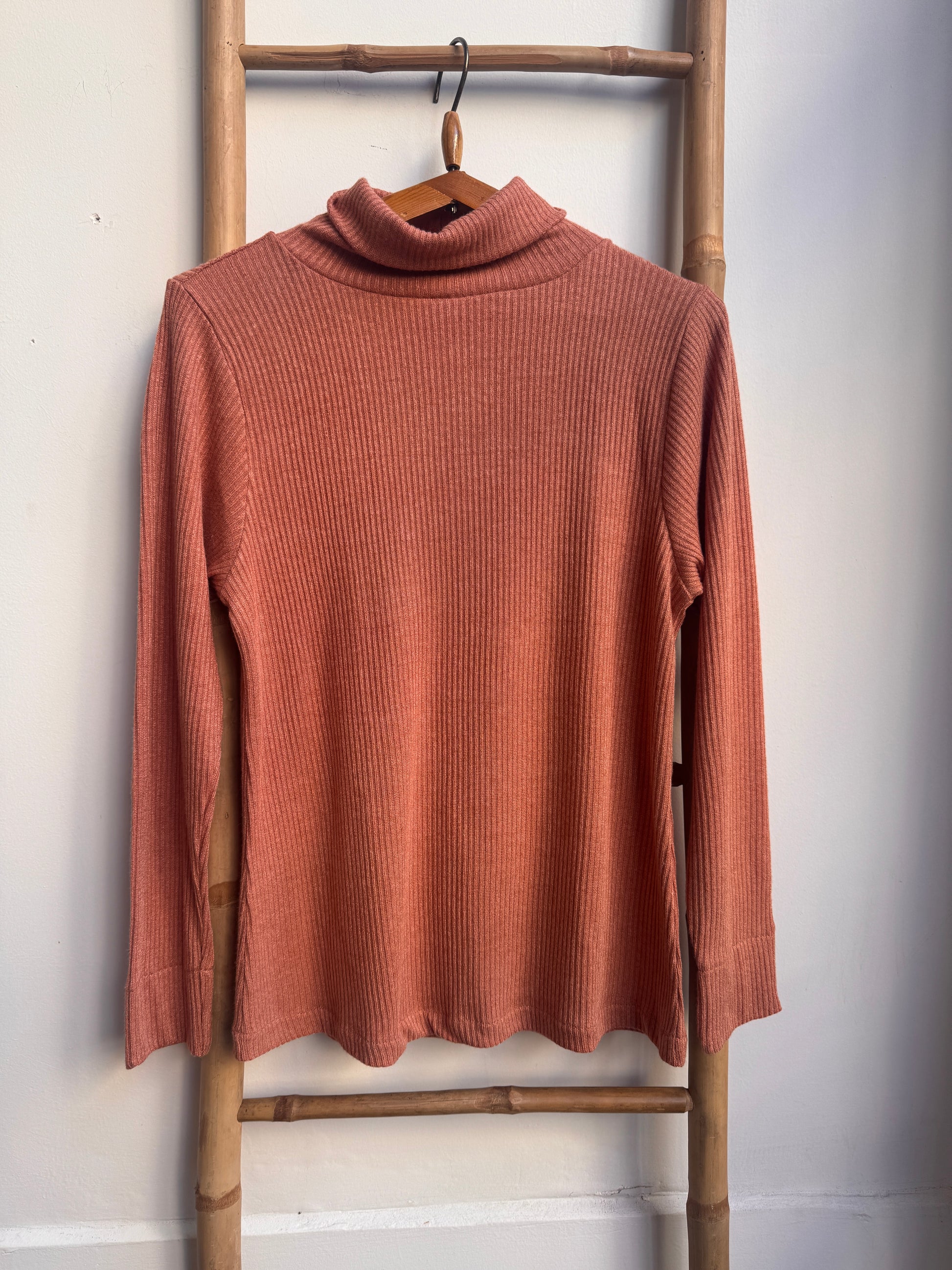 חולצת גולף בייסיקית, קרובה לגוף בצבע שכתום עדין ופסטלי מסריג ויסקוזה מעורב נעים מאוד למגע